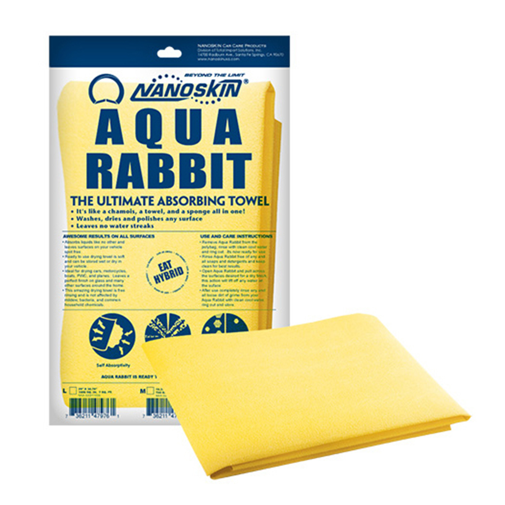 SKU: NAA-SSDT "¢ It's like a chamois, a towel, and a sponge all in one! "¢ Washes, dries and polishes any surface "¢ Leaves no water streaks AWESOME RESULTS ON ALL SURFACES "¢ Absorbs liquids like no other and leaves surfaces on your vehicle spot free. "¢ Ready to use drying towel is soft and can be stored wet or dry in your vehicle. "¢Ideal fro drying cars, motorcycles, boats, PWC, and planes. Leaves a perfect finish on glass and many other surfaces around the home. "¢ This amazing drying towel is free rinsing and is not affected by mildew, bacteria, and common household chemicals. USE AND CARE INSTRUCTIONS "¢ Remove Aqua Rabbit from the polybag, rinse with clean cool water and ring out...Its now ready for use. "¢ Rinse Aqua Rabbit free of any and all soaps and detergents and keep clean for best results. "¢ Open Aqua Rabbit and pull across the surfaces desired for a dry finish, this action will lift off any water on the surface. "¢ After use completely rinse any and all loose dirt of grime from your Aqua Rabbit with clean cool water, ring out and store.