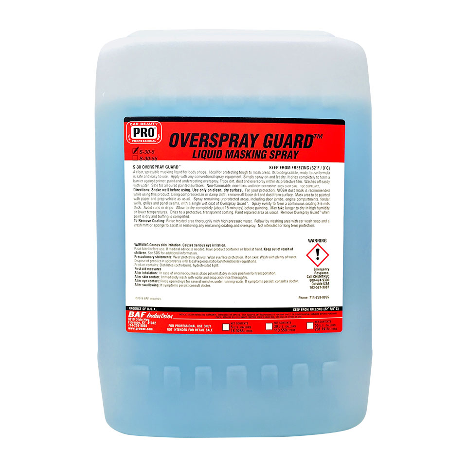 Overspray Guard™ is a clear, sprayable masking liquid for body shops that, once applied, dries completely to form a barrier against primer, paint and undercoating overspray. Ideal for protecting those tough to mask areas. Overspray Guard™ is a ready to use, biodegradable, water-base liquid that is safe and easy to use. Contains water emulsified resin encapsulated in a thickening agent to create a smooth film that flows out evenly and dries quickly. Simply spray on surface with any spray gun system and allow to dry. Traps dirt and dust under its film and airborne dust and overspray on top of its protective film. Washes off easily with water. Safe for all cured painted surfaces. Contains a pleasant grape fragrance. BODY SHOP SAFE. VOC COMPLIANT.