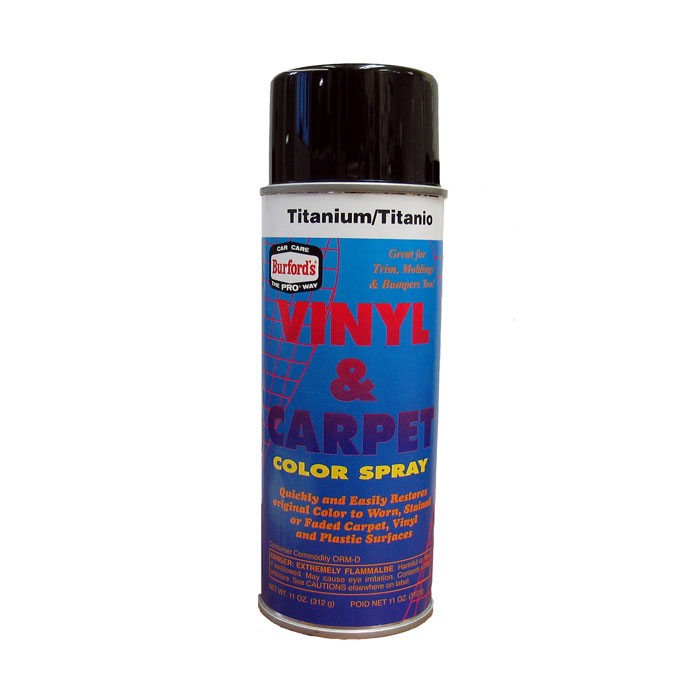 Burford's® Titanium Aerosol Vinyl & Carpet Color Spray revitalizes worn, stained or faded vinyl surfaces, low pile carpets, flexible and rigid plastics and velour quickly and easily. AVC's unique formula bonds with the material to create a tough, permanent, yet flexible, fade resistant coating of brilliant color. Also restores scratched, worn or faded areas on vinyl tops & seats, headrests, door panels, bumpers and other hard plastic surfaces throughout your auto, RV or boat. This quick drying, protective coating is resistant to chipping, peeling and cracking. Net Wt 16 oz. aerosol can. VOC COMPLIANT.