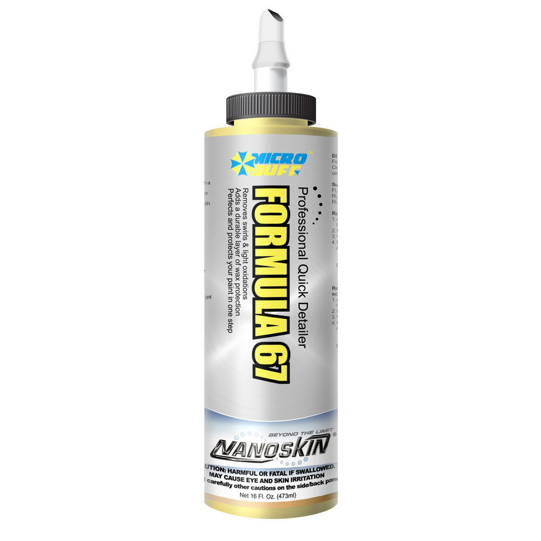 Nanoskin FORMULA 67 Professional Quick Detailer removes swirls, water spots, stains and light oxidation while restoring gloss and adding a durable layer of wax protection. FORMULA 67 can be applied by hand, with a dual action polisher or a rotary polisher. Application couldn 't be easier than with Nanoskin MICROBUFF Polishing Pad and a dual action polisher. Whether you 're a novice or a pro, you 'll get expert results. If the paint is severely neglected, use Nanoskin NANO CUT Finishing Compound with MICROBUFF Cutting Pad prior to using FORMULA 67.