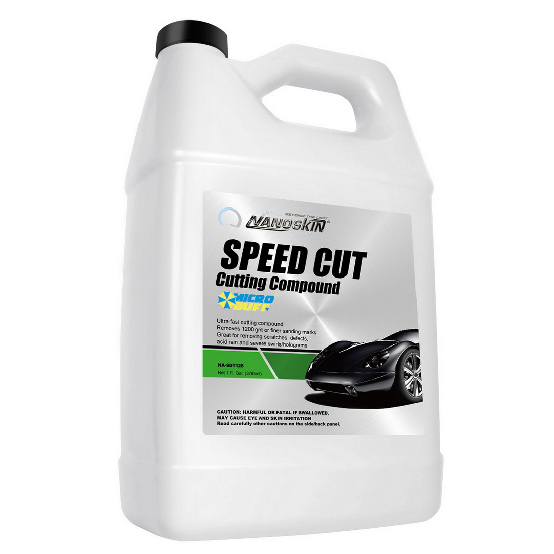 Unlike traditional compounds that leave compounding swirls, Nanoskin SPEED CUT Cutting Compound leaves a deep shine with few swirl marks. By using with MICROBUFF Cutting Pad, the abrasives cut quickly to remove 1200 grit sanding scratches, acid rain, and severe swirls and holograms. A quick pass with Nanoskin NANO CUT Finishing Compound will completely restore the shine and prepare the paint for wax. Nanoskin SPEED CUT is body shop safe, paintable, and contains no fillers. This safe, VOC compliant formula can be used on all paint finishes, including scratch-resistant and conventional clear coats.